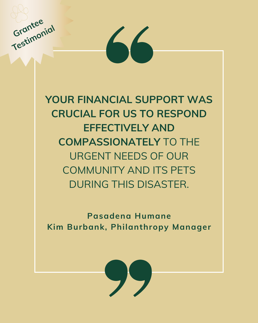 OUR IMPACT: The Human-Animal Alliance provided financial aid to provide a lifeline for pets impacted by the fires. Our grant funds ensured that displaced companion animals received proper medical care, food, and safe shelter during and after the wildfires. Additionally, this partnership supported efforts to reunify as many pets as possible with their families.