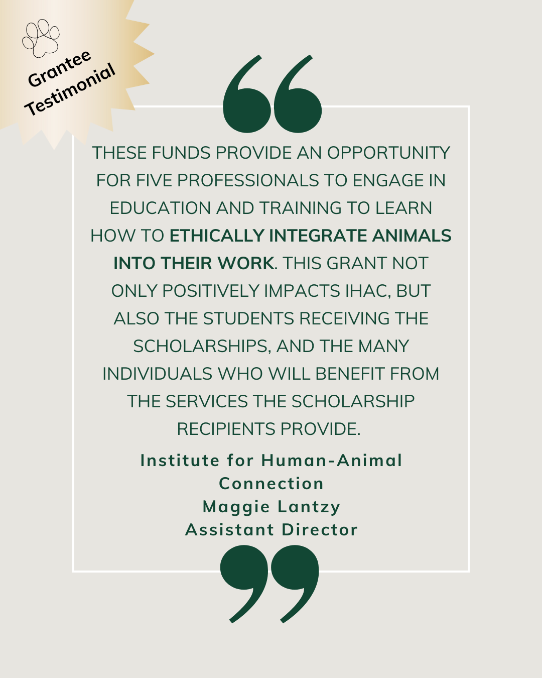 OUR IMPACT: The Human-Animal Alliance sponsored a scholarship fund dedicated to advancing the careers of students desiring to incorporate human-animal interactions into their work. Our grant provided five students with supplemental funds to support their enrollment in educational programs offered by the Institute for Human-Animal Connection. We are proud to invest in this next generation of professionals in this important and evolving field, contributing to the further success of their private practices, organizations, clients, and beyond.